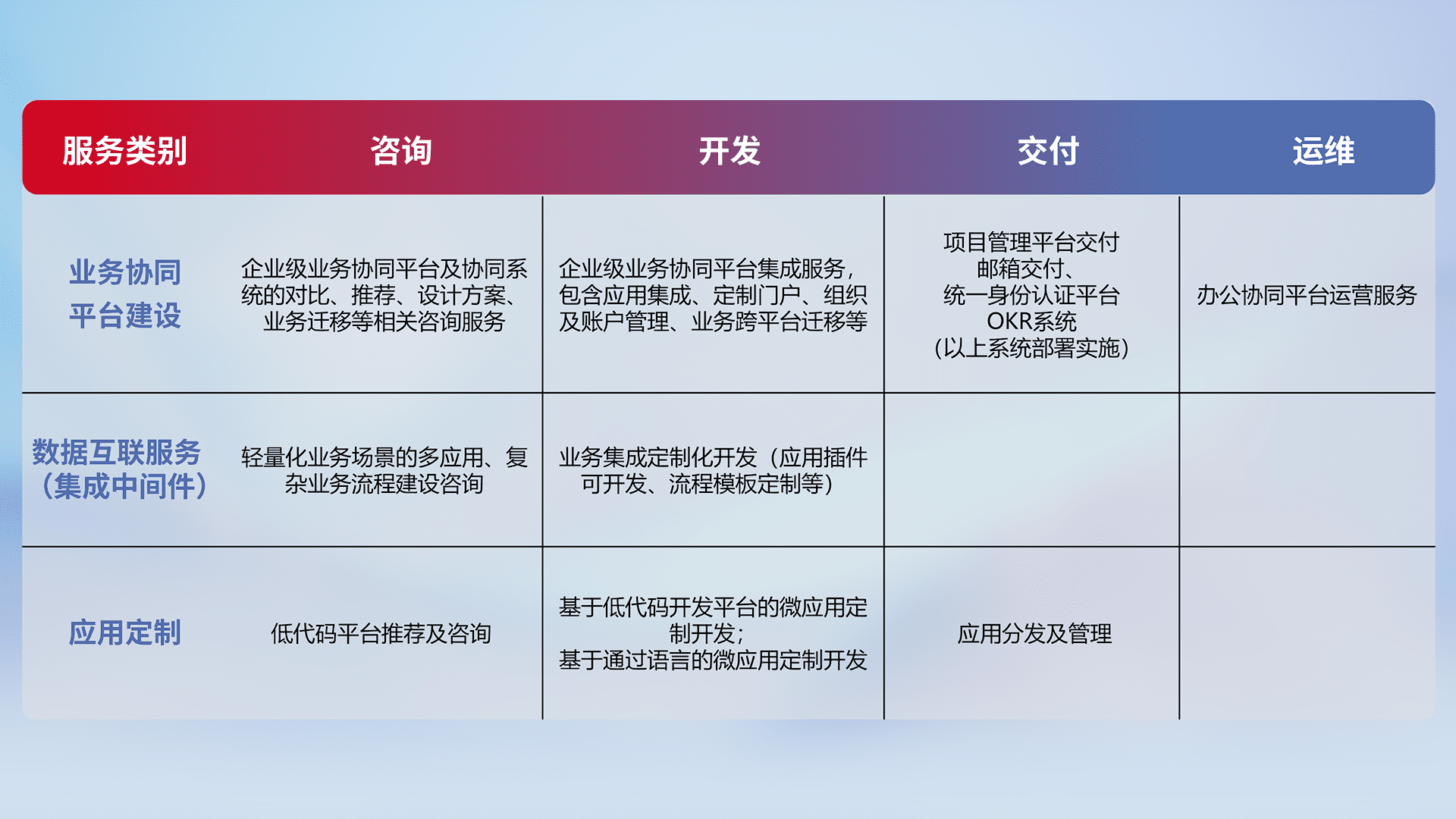 针对钉钉、、、企微、、、、IDaas等平台级产品提供产品的规划、、、方案、、、、交付、、、定制化开发等服务,,实现如统一协同办公、、、、智能客户服务、、、混合会议管理、、、、智能数据查询、、等业务场景,,实现数字化转型。。
